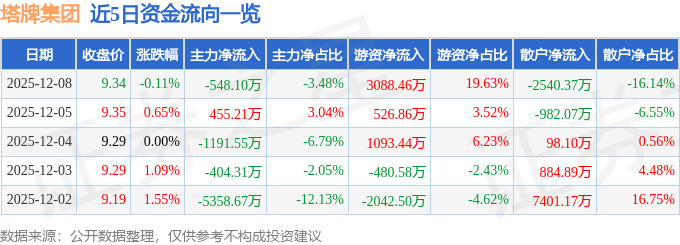证券之星消息,截至2025年12月8日收盘,塔牌集团(002233)报收于9.34元,下跌0.11%,换手率1.42%,成交量16.9万手,成交额1.57亿元。