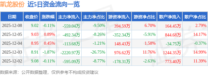 12月8日的资金流向数据方面,主力资金净流出559.04万元,占总成交额9.5%,游资资金净流入394.59万元,占总成交额6.7%,散户资金净流入164.45万元,占总成交额2.79%。