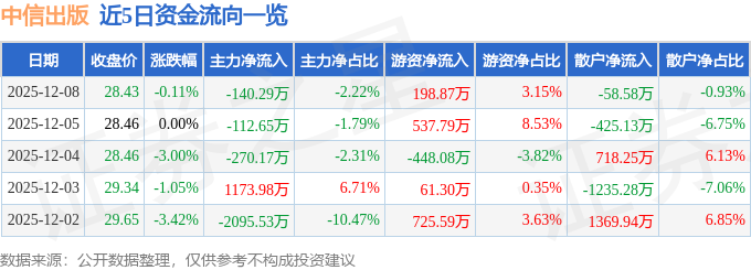 证券之星消息,截至2025年12月8日收盘,中信出版(300788)报收于28.43元,下跌0.11%,换手率1.16%,成交量2.21万手,成交额6306.96万元。