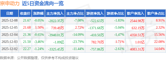 证券之星消息,截至2025年12月8日收盘,宗申动力(001696)报收于21.67元,下跌0.05%,换手率1.48%,成交量13.17万手,成交额2.86亿元。