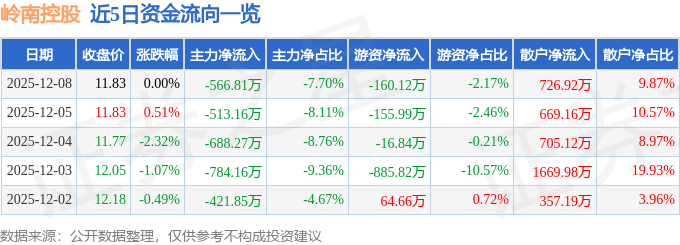 证券之星消息,截至2025年12月8日收盘,岭南控股(000524)报收于11.83元,上涨0.0%,换手率0.93%,成交量6.24万手,成交额7365.2万元。