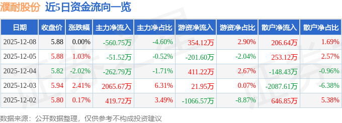 证券之星消息,截至2025年12月8日收盘,濮耐股份(002225)报收于5.88元,上涨0.0%,换手率2.13%,成交量20.79万手,成交额1.22亿元。