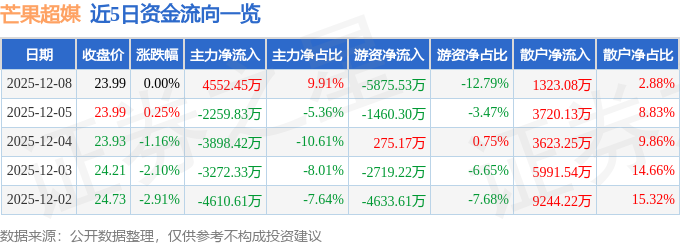 证券之星消息,截至2025年12月8日收盘,芒果超媒(300413)报收于23.99元,上涨0.0%,换手率1.87%,成交量19.14万手,成交额4.59亿元。