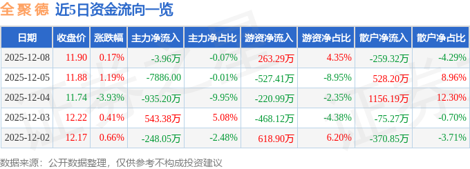 证券之星消息,截至2025年12月8日收盘,全 聚 德(002186)报收于11.9元,上涨0.17%,换手率1.66%,成交量5.1万手,成交额6046.08万元。