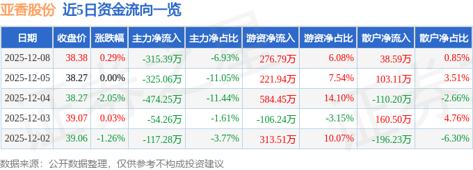 12月8日的资金流向数据方面,主力资金净流出315.39万元,占总成交额6.93%,游资资金净流入276.79万元,占总成交额6.08%,散户资金净流入38.59万元,占总成交额0.85%。