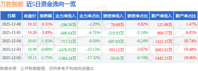 证券之星消息,截至2025年12月8日收盘,万胜智能(300882)报收于19.32元,上涨0.31%,换手率1.67%,成交量4.45万手,成交额8588.78万元。