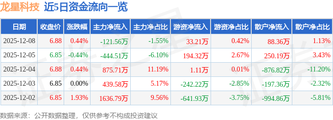 证券之星消息,截至2025年12月8日收盘,龙星科技(002442)报收于6.88元,上涨0.44%,换手率2.32%,成交量11.45万手,成交额7850.17万元。