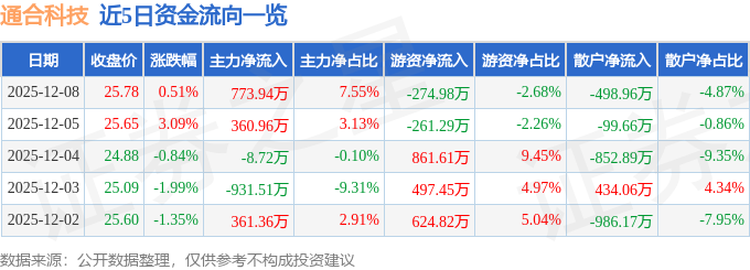 证券之星消息,截至2025年12月8日收盘,通合科技(300491)报收于25.78元,上涨0.51%,换手率2.56%,成交量3.98万手,成交额1.02亿元。