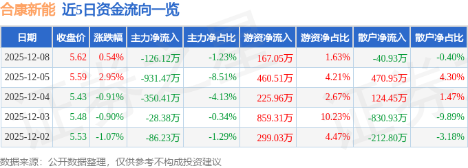 证券之星消息,截至2025年12月8日收盘,合康新能(300048)报收于5.62元,上涨0.54%,换手率1.61%,成交量18.15万手,成交额1.02亿元。