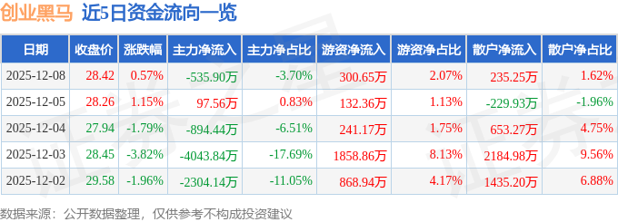 证券之星消息,截至2025年12月8日收盘,创业黑马(300688)报收于28.42元,上涨0.57%,换手率3.42%,成交量5.08万手,成交额1.45亿元。