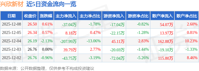 证券之星消息,截至2025年12月8日收盘,兴欣新材(001358)报收于26.5元,上涨0.61%,换手率1.53%,成交量7804.0手,成交额2081.93万元。