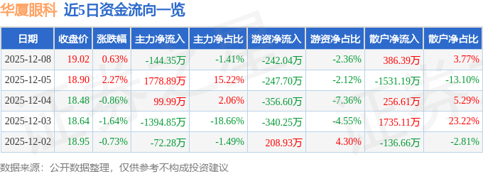 证券之星消息,截至2025年12月8日收盘,华厦眼科(301267)报收于19.02元,上涨0.63%,换手率0.84%,成交量5.42万手,成交额1.02亿元。