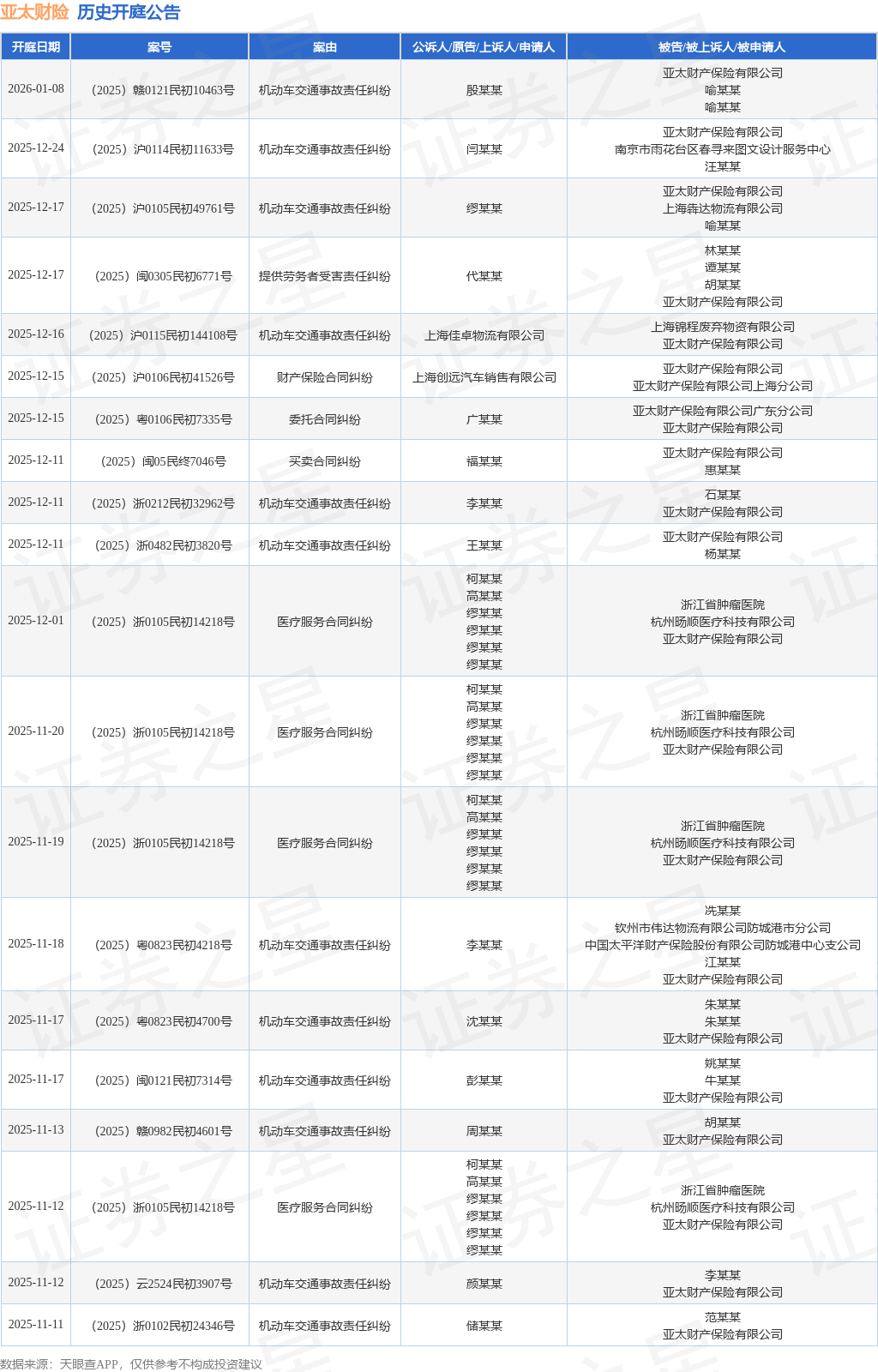 案号:(2025)闽05民终7046号根据统计,近一年内以亚太财产保险有限公司为当事人的历史开庭公告有185则,其中案由为“机动车交通事故责任纠纷”的公告以88则居首,其次为“保险人代位求偿权纠纷”有14则,“责任保险合同纠纷”有12则。历史开庭公告(前20条)如下: