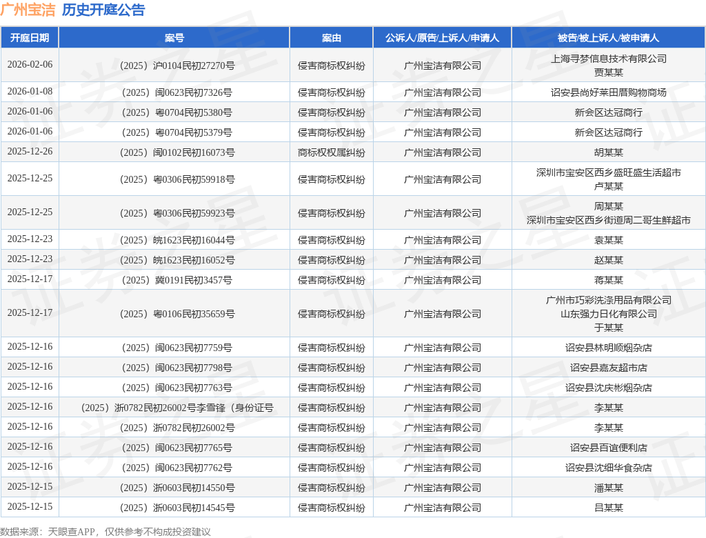 案号:(2025)赣1104民初6656号根据统计,近一年内以广州宝洁有限公司为当事人的历史开庭公告有1500则,其中案由为“侵害商标权纠纷”的公告以1241则居首,其次为“商标权权属、侵权纠纷”有114则,“侵害商标权”有88则。历史开庭公告(前20条)如下: