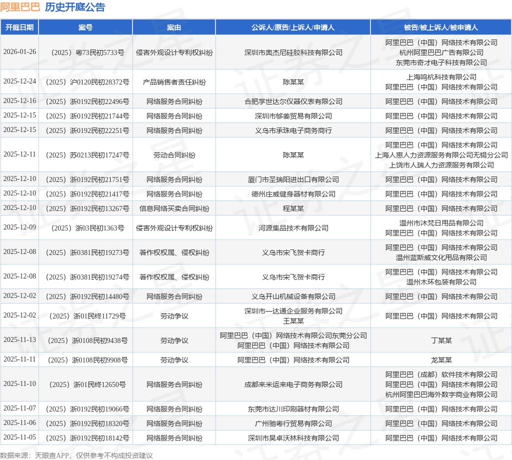 案号:(2025)苏0213民初17247号根据统计,近一年内以阿里巴巴(中国)网络技术有限公司为当事人的历史开庭公告有177则,其中案由为“网络服务合同纠纷”的公告以70则居首,其次为“侵害外观设计专利权纠纷”有17则,“著作权权属、侵权纠纷”有13则。历史开庭公告(前20条)如下: