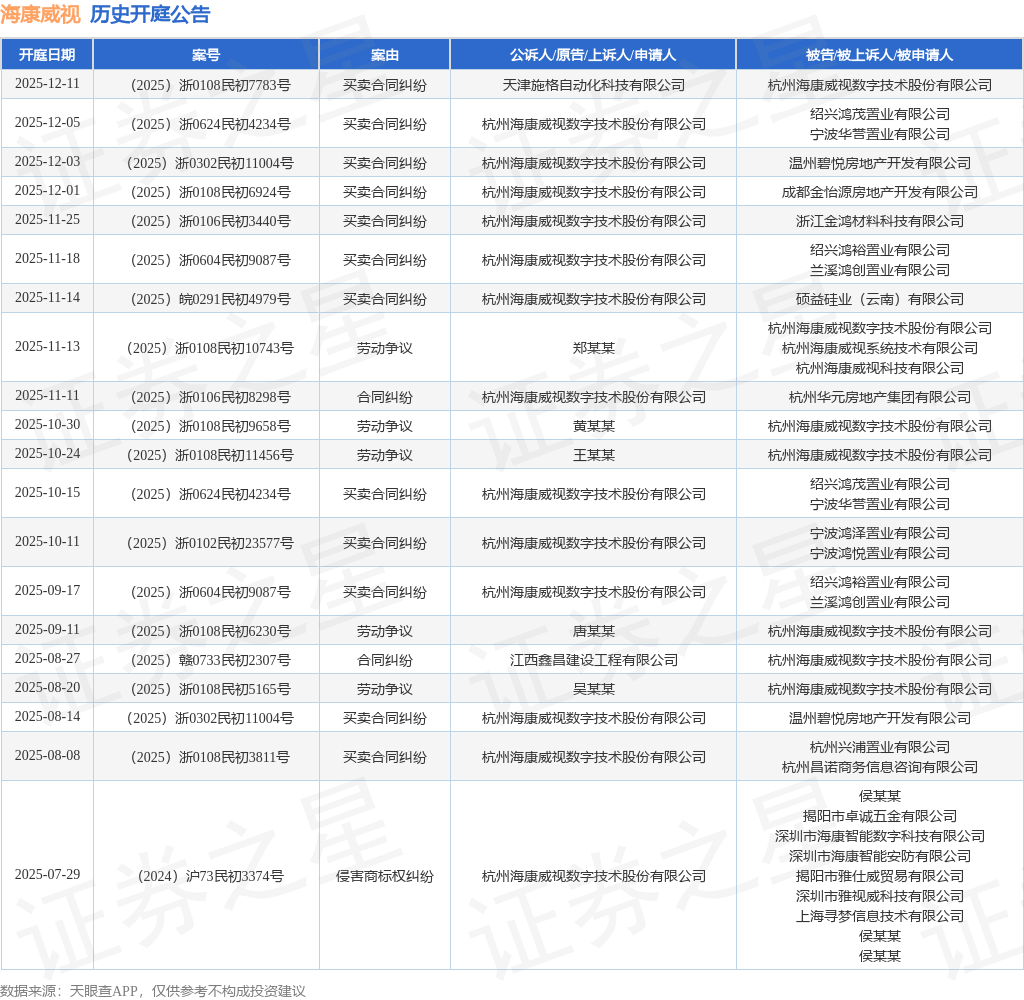 案号:(2025)浙0108民初7783号根据统计,近一年内以杭州海康威视数字技术股份有限公司为当事人的历史开庭公告有62则,其中案由为“买卖合同纠纷”的公告以47则居首,其次为“劳动争议”有5则,“合同纠纷”有4则。历史开庭公告(前20条)如下: