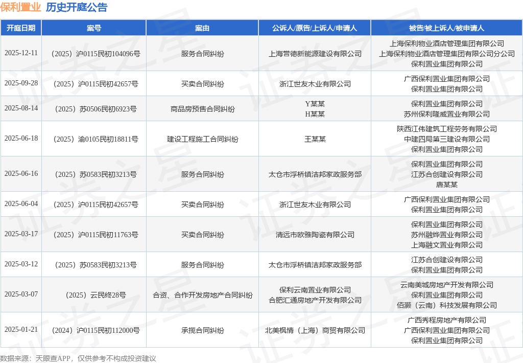 案号:(2025)沪0115民初104096号根据统计,近一年内以保利置业集团有限公司为当事人的历史开庭公告有10则,其中案由为“买卖合同纠纷”的公告以3则居首,其次为“服务合同纠纷”有3则,“合资、合作开发房地产合同纠纷”有1则。历史开庭公告如下: