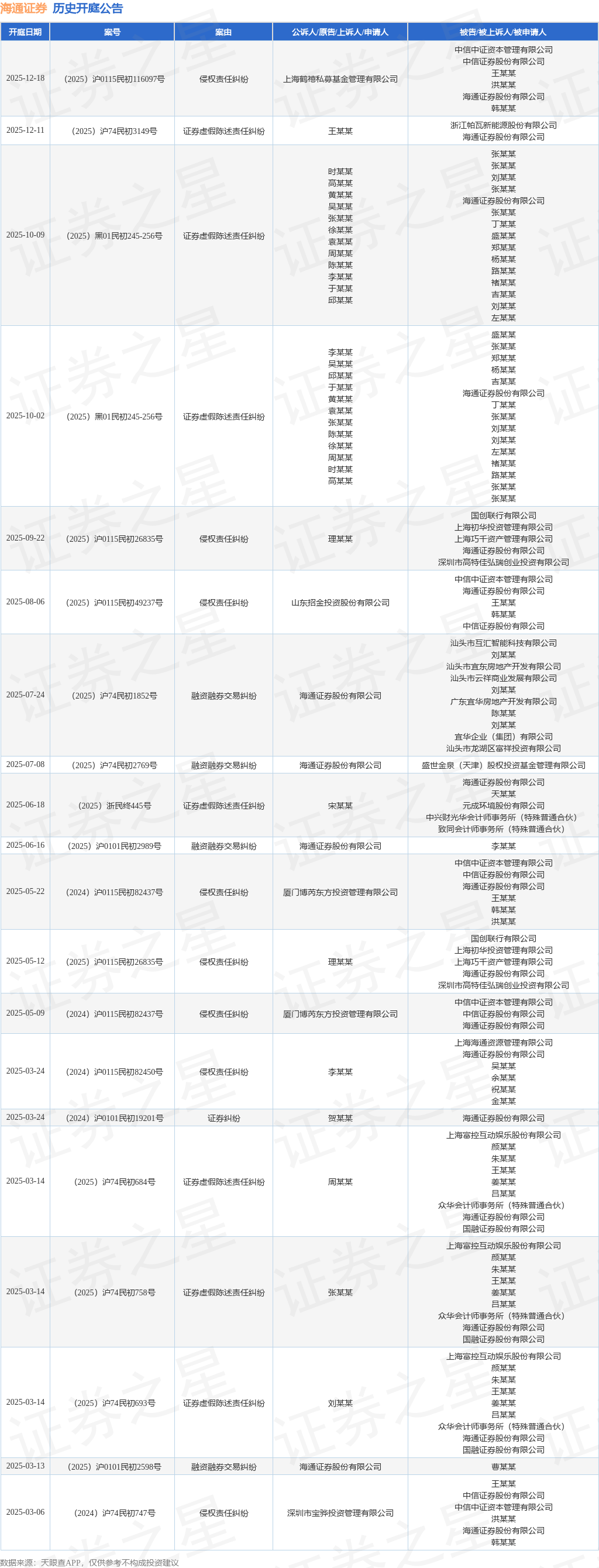 案号:(2025)沪74民初3149号根据统计,近一年内以海通证券股份有限公司为当事人的历史开庭公告有23则,其中案由为“侵权责任纠纷”的公告以9则居首,其次为“证券虚假陈述责任纠纷”有8则,“融资融券交易纠纷”有4则。历史开庭公告(前20条)如下: