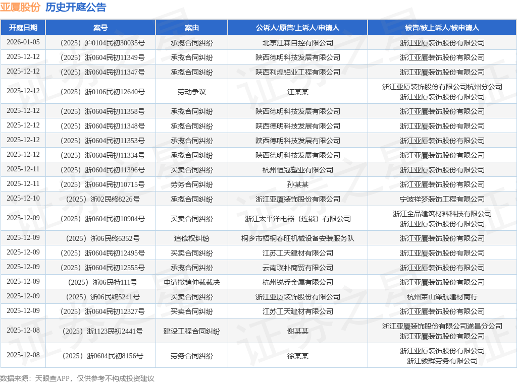 案号:(2025)浙0604民初10715号根据统计,近一年内以浙江亚厦装饰股份有限公司为当事人的历史开庭公告有593则,其中案由为“买卖合同纠纷”的公告以212则居首,其次为“劳务合同纠纷”有112则,“建设工程施工合同纠纷”有59则。历史开庭公告(前20条)如下: