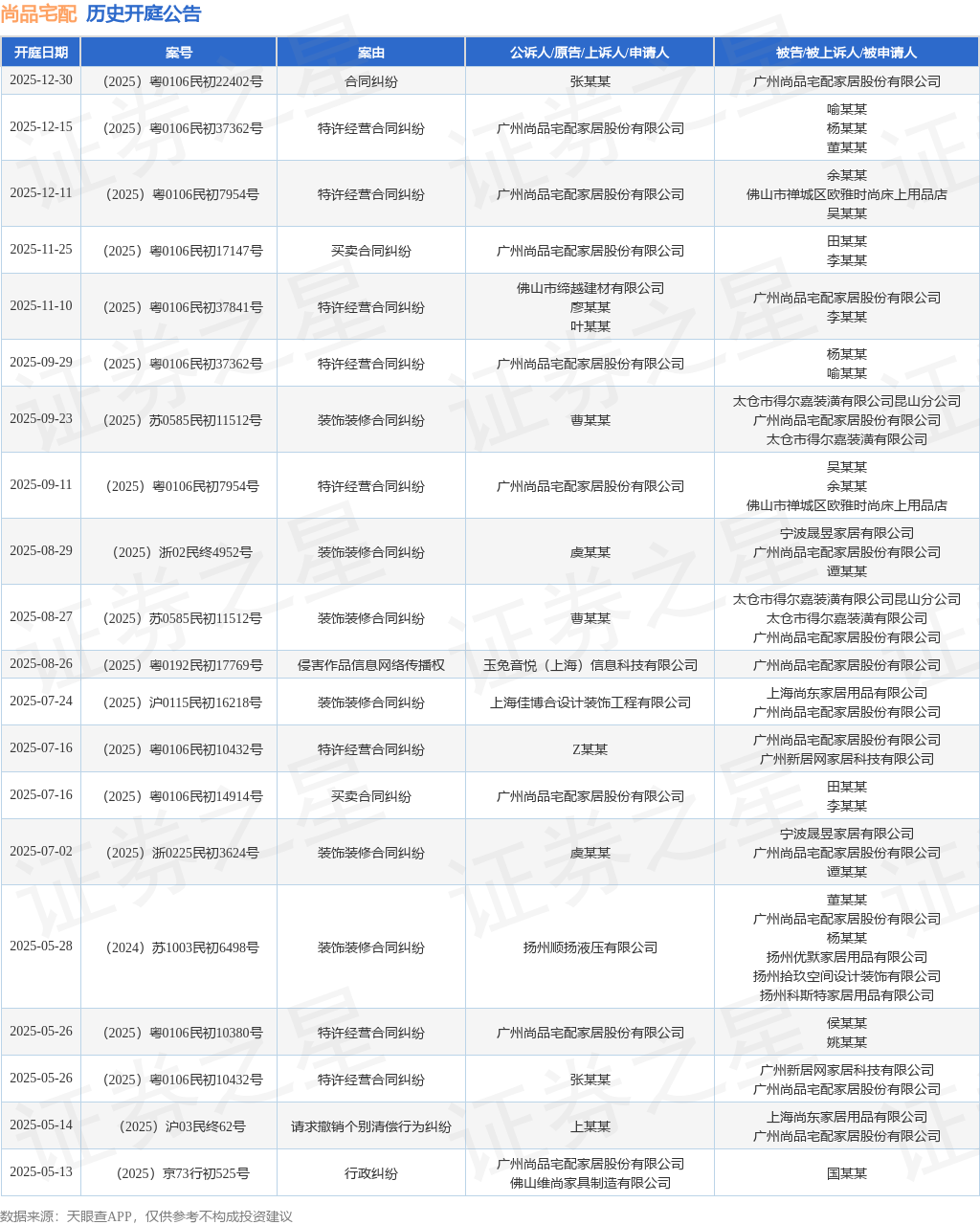 案号:(2025)粤0106民初7954号根据统计,近一年内以广州尚品宅配家居股份有限公司为当事人的历史开庭公告有39则,其中案由为“买卖合同纠纷”的公告以12则居首,其次为“特许经营合同纠纷”有11则,“装饰装修合同纠纷”有10则。历史开庭公告(前20条)如下: