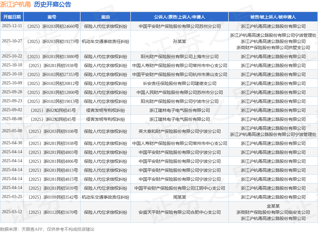 案号:(2025)浙0203民初24660号根据统计,近一年内以浙江沪杭甬高速公路股份有限公司为当事人的历史开庭公告有19则,其中案由为“保险人代位求偿权纠纷”的公告以15则居首,其次为“侵害发明专利权纠纷”有2则,“机动车交通事故责任纠纷”有2则。历史开庭公告如下: