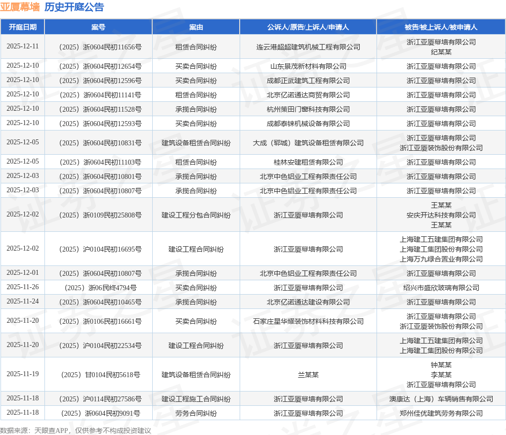 案号:(2025)浙0604民初11656号根据统计,近一年内以浙江亚厦幕墙有限公司为当事人的历史开庭公告有227则,其中案由为“买卖合同纠纷”的公告以40则居首,其次为“建设工程施工合同纠纷”有38则,“建设工程分包合同纠纷”有27则。历史开庭公告(前20条)如下: