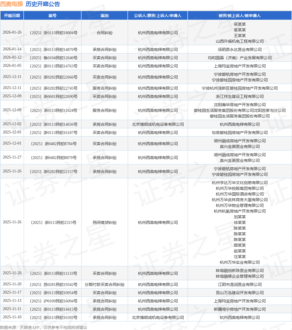 案号:(2025)浙0282民初22745号根据统计,近一年内以杭州西奥电梯有限公司为当事人的历史开庭公告有173则,其中案由为“买卖合同纠纷”的公告以75则居首,其次为“承揽合同纠纷”有57则,“合同纠纷”有13则。历史开庭公告(前20条)如下: