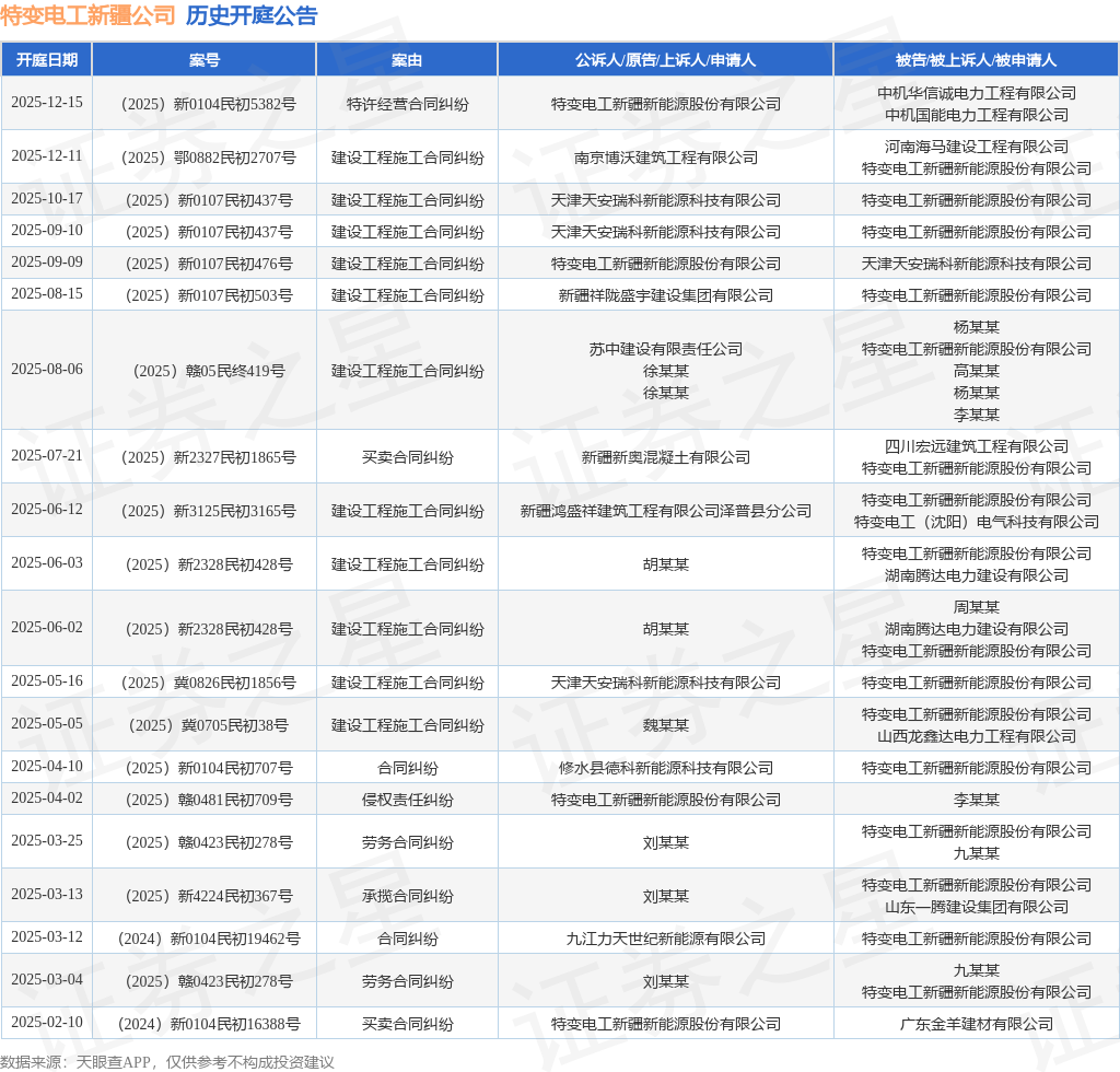 案号:(2025)鄂0882民初2707号根据统计,近一年内以特变电工新疆新能源股份有限公司为当事人的历史开庭公告有24则,其中案由为“建设工程施工合同纠纷”的公告以14则居首,其次为“买卖合同纠纷”有3则,“劳务合同纠纷”有2则。历史开庭公告(前20条)如下:
