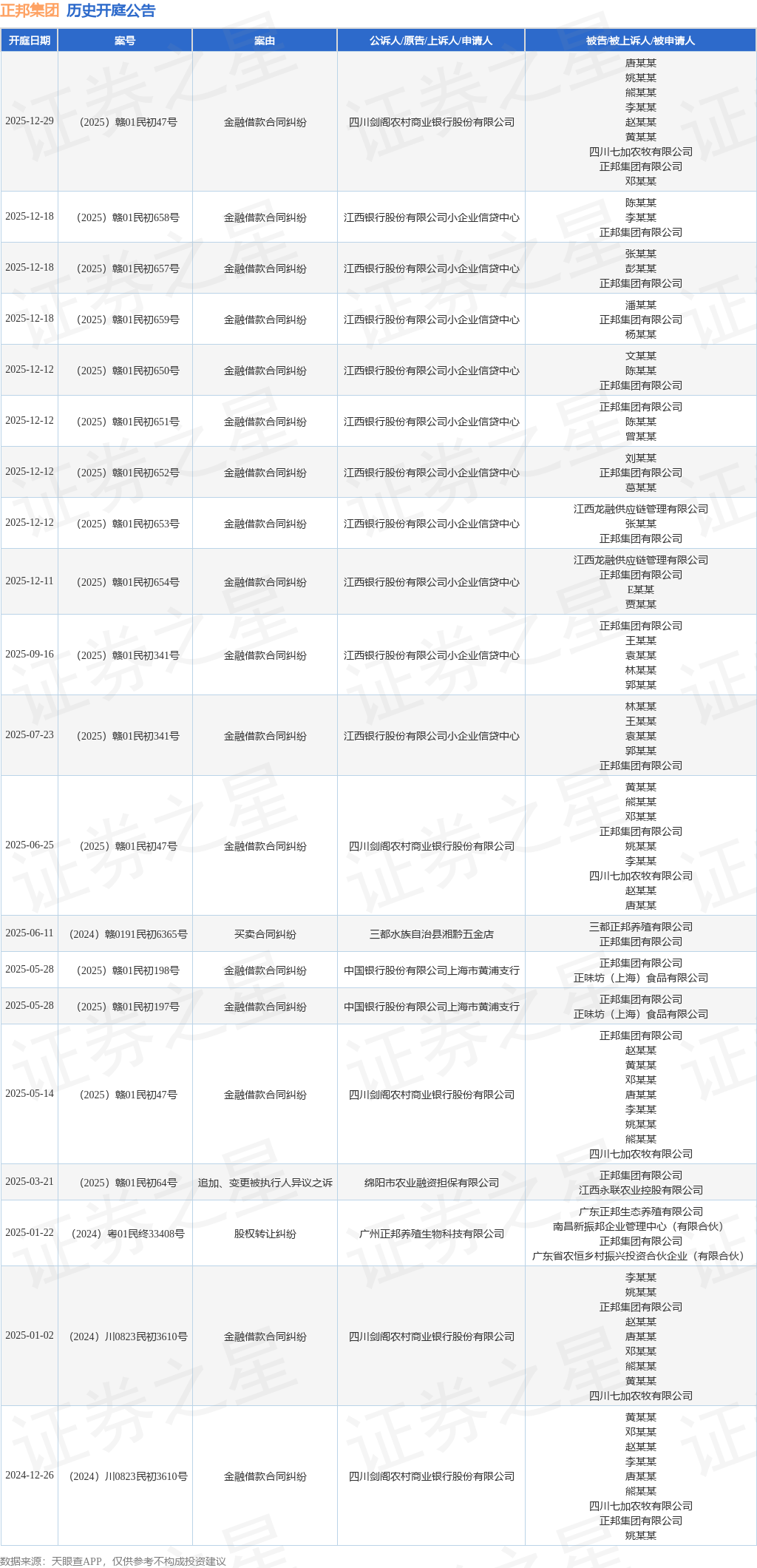根据统计,近一年内以正邦集团有限公司为当事人的历史开庭公告有20则,其中案由为“金融借款合同纠纷”的公告以17则居首,其次为“买卖合同纠纷”有1则,“股权转让纠纷”有1则。历史开庭公告如下: