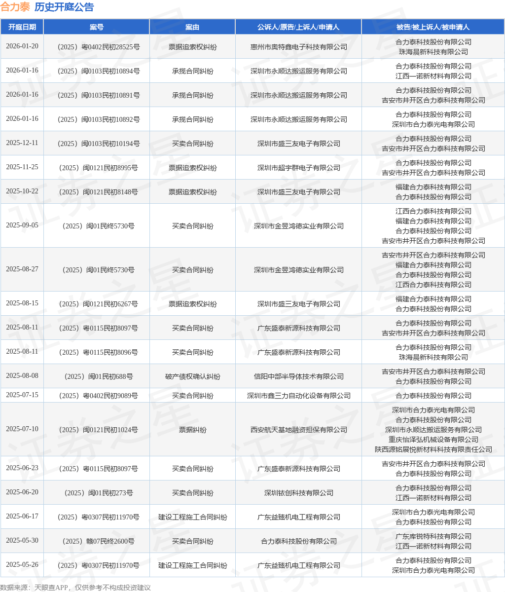案号:(2025)闽0103民初10194号根据统计,近一年内以合力泰科技股份有限公司为当事人的历史开庭公告有48则,其中案由为“买卖合同纠纷”的公告以20则居首,其次为“票据纠纷”有10则,“票据追索权纠纷”有8则。历史开庭公告(前20条)如下: