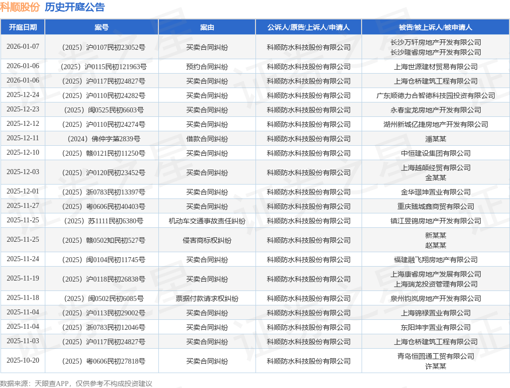 案号:(2024)佛仲字第2839号根据统计,近一年内以科顺防水科技股份有限公司为当事人的历史开庭公告有149则,其中案由为“买卖合同纠纷”的公告以99则居首,其次为“票据纠纷”有15则,“侵害商标权纠纷”有10则。历史开庭公告(前20条)如下: