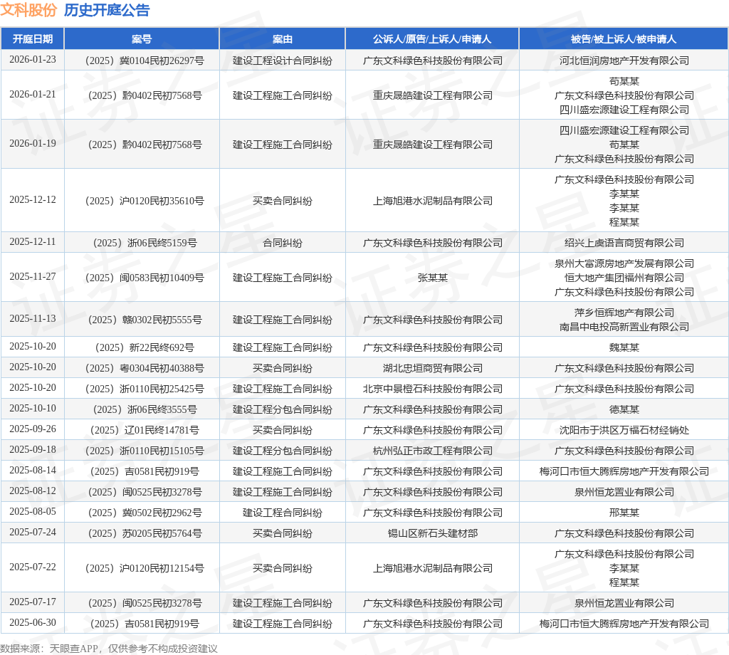案号:(2025)浙06民终5159号根据统计,近一年内以广东文科绿色科技股份有限公司为当事人的历史开庭公告有96则,其中案由为“建设工程施工合同纠纷”的公告以31则居首,其次为“买卖合同纠纷”有14则,“劳务合同纠纷”有14则。历史开庭公告(前20条)如下: