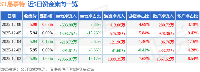 证券之星消息,截至2025年12月8日收盘,ST易事特(300376)报收于5.98元,上涨0.67%,换手率0.63%,成交量14.76万手,成交额8800.24万元。