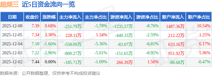 证券之星消息,截至2025年12月8日收盘,超频三(300647)报收于7.39元,上涨0.68%,换手率4.18%,成交量19.11万手,成交额1.41亿元。