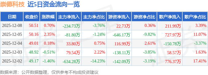证券之星消息,截至2025年12月8日收盘,崇德科技(301548)报收于50.51元,上涨0.7%,换手率4.73%,成交量1.24万手,成交额6250.17万元。