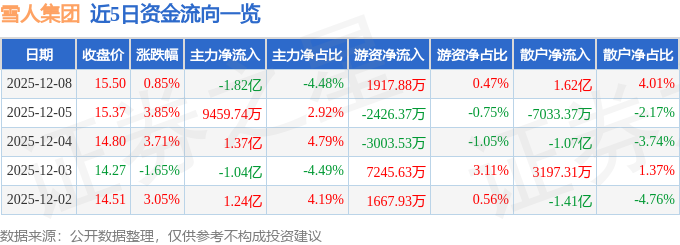 证券之星消息,截至2025年12月8日收盘,雪人集团(002639)报收于15.5元,上涨0.85%,换手率39.2%,成交量255.03万手,成交额40.52亿元。