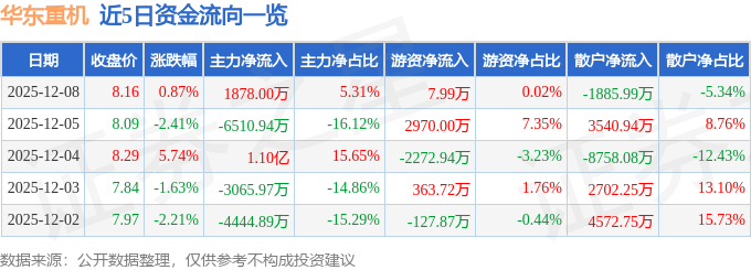 证券之星消息,截至2025年12月8日收盘,华东重机(002685)报收于8.16元,上涨0.87%,换手率4.32%,成交量43.53万手,成交额3.53亿元。