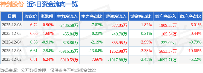 证券之星消息,截至2025年12月8日收盘,神剑股份(002361)报收于6.72元,上涨0.9%,换手率5.82%,成交量47.1万手,成交额3.18亿元。