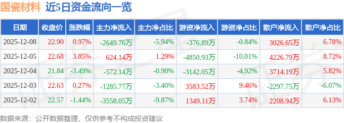 证券之星消息,截至2025年12月8日收盘,国瓷材料(300285)报收于22.9元,上涨0.97%,换手率2.3%,成交量19.38万手,成交额4.46亿元。