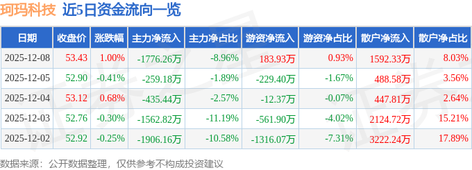 证券之星消息,截至2025年12月8日收盘,珂玛科技(301611)报收于53.43元,上涨1.0%,换手率2.53%,成交量3.71万手,成交额1.98亿元。