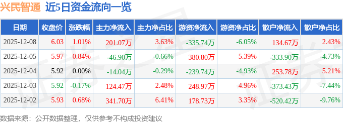 证券之星消息,截至2025年12月8日收盘,兴民智通(002355)报收于6.03元,上涨1.01%,换手率1.49%,成交量9.22万手,成交额5545.36万元。