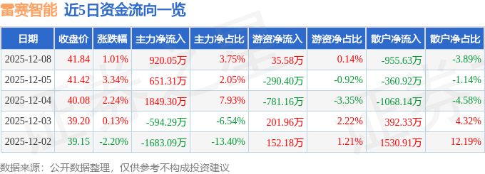 证券之星消息,截至2025年12月8日收盘,雷赛智能(002979)报收于41.84元,上涨1.01%,换手率2.67%,成交量5.91万手,成交额2.45亿元。