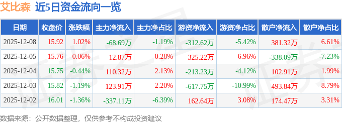 证券之星消息,截至2025年12月8日收盘,艾比森(300389)报收于15.92元,上涨1.02%,换手率1.56%,成交量3.63万手,成交额5772.54万元。