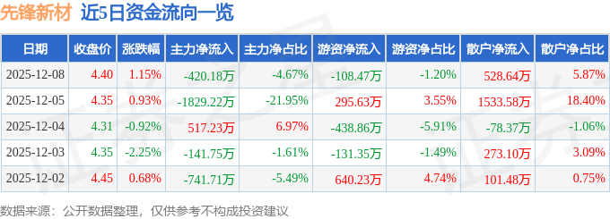 证券之星消息,截至2025年12月8日收盘,先锋新材(300163)报收于4.4元,上涨1.15%,换手率4.52%,成交量20.52万手,成交额9004.69万元。