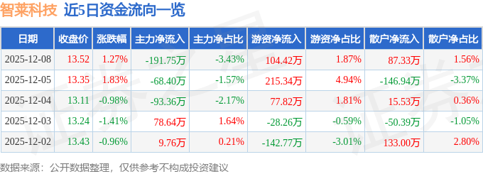 证券之星消息,截至2025年12月8日收盘,智莱科技(300771)报收于13.52元,上涨1.27%,换手率2.29%,成交量4.14万手,成交额5595.62万元。