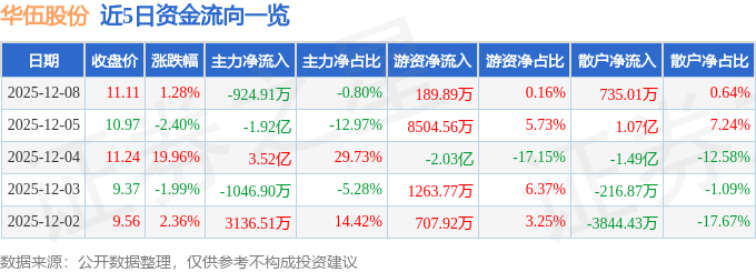 证券之星消息,截至2025年12月8日收盘,华伍股份(300095)报收于11.11元,上涨1.28%,换手率30.58%,成交量103.57万手,成交额11.55亿元。