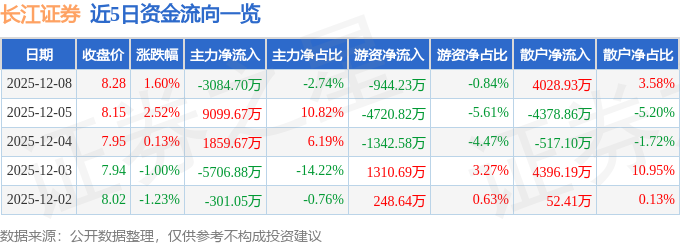 证券之星消息,截至2025年12月8日收盘,长江证券(000783)报收于8.28元,上涨1.6%,换手率2.43%,成交量134.65万手,成交额11.26亿元。