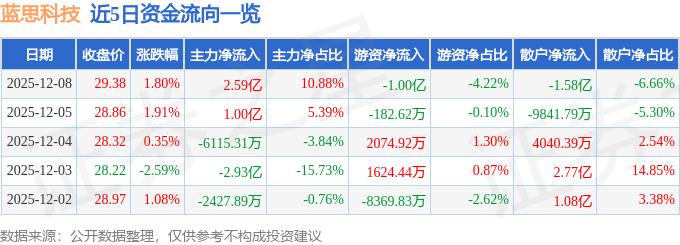证券之星消息,截至2025年12月8日收盘,蓝思科技(300433)报收于29.38元,上涨1.8%,换手率1.64%,成交量81.32万手,成交额23.77亿元。