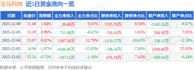 证券之星消息,截至2025年12月8日收盘,玉马科技(300993)报收于15.48元,上涨1.84%,换手率3.48%,成交量8.37万手,成交额1.29亿元。