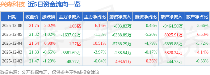 证券之星消息,截至2025年12月8日收盘,兴森科技(002436)报收于21.75元,上涨2.02%,换手率5.09%,成交量76.89万手,成交额16.71亿元。